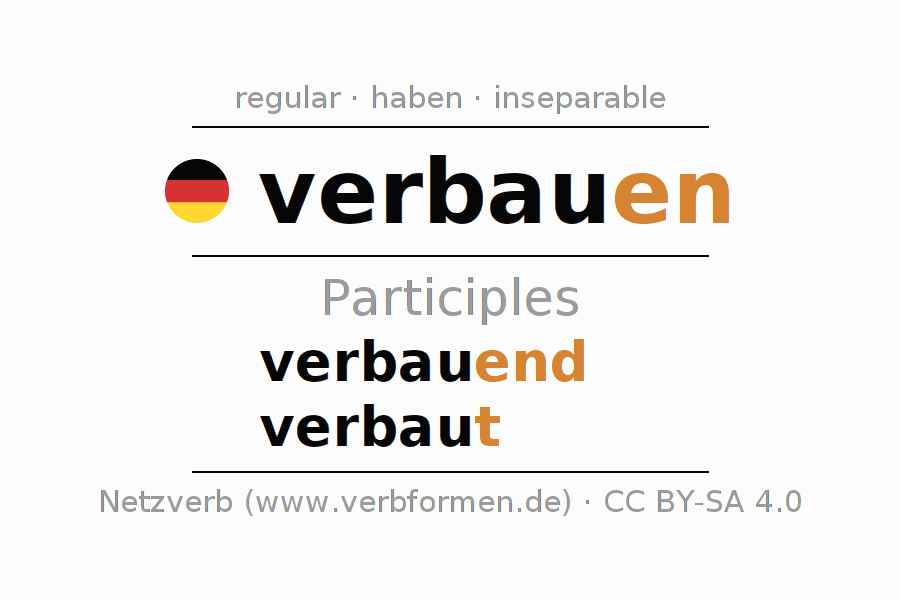 The conjugation of verbauen in Participle Present Perfect part of speech Active is verbauend, verbaut.The conjugation corresponds to certain grammatical rules. Likewise the requirements for the conjugation of the simple verb forms of verbauen in Participle. Comments ☆