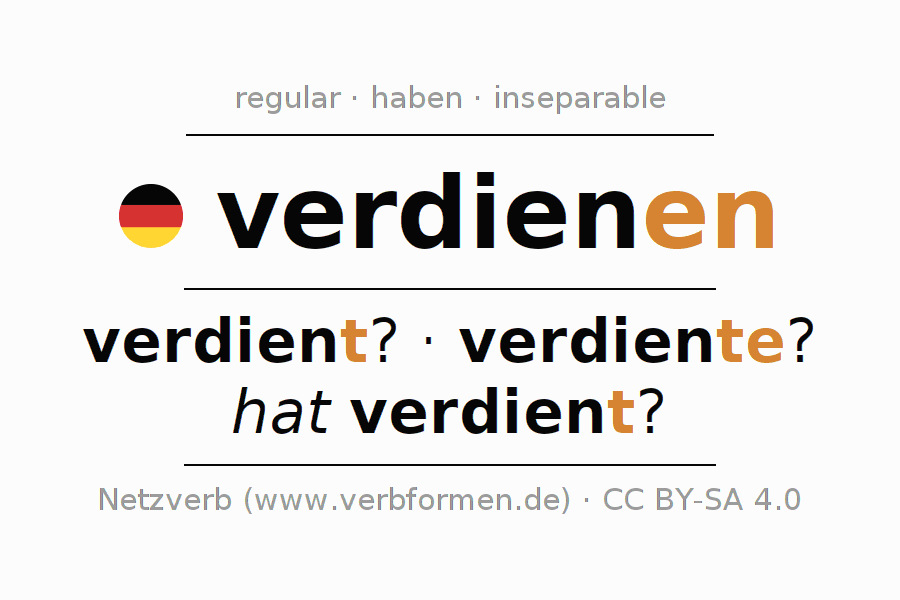 The conjugation of verdienen in Participle Present Perfect part of speech Active is verdienend, verdient.The conjugation corresponds to certain grammatical rules. Likewise the requirements for the conjugation of the simple verb forms of verdienen in Participle. Comments ☆