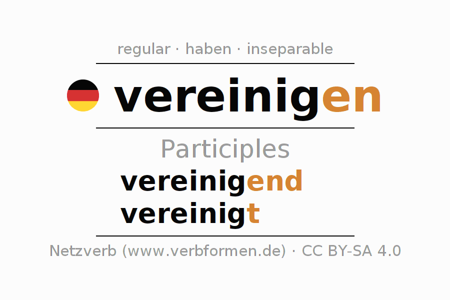 The conjugation of vereinigen in Participle Present Perfect part of speech Active is vereinigend, vereinigt.The conjugation corresponds to certain grammatical rules. Likewise the requirements for the conjugation of the simple verb forms of vereinigen in Participle. Comments ☆