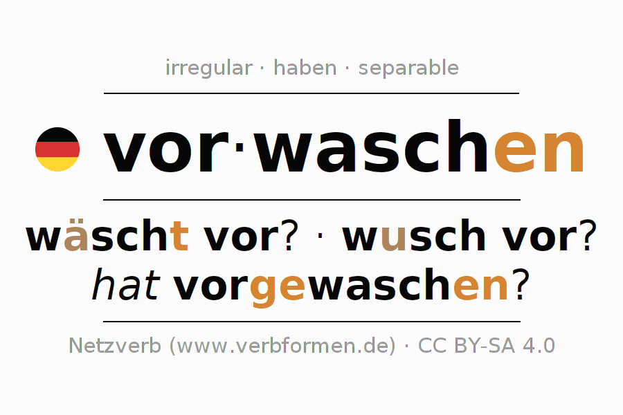 The conjugation of vorwaschen in Participle Present Perfect part of speech Active is vorwaschend, vorgewaschen.The conjugation corresponds to certain grammatical rules. Likewise the requirements for the conjugation of the simple verb forms of vorwaschen in Participle. Comments ☆