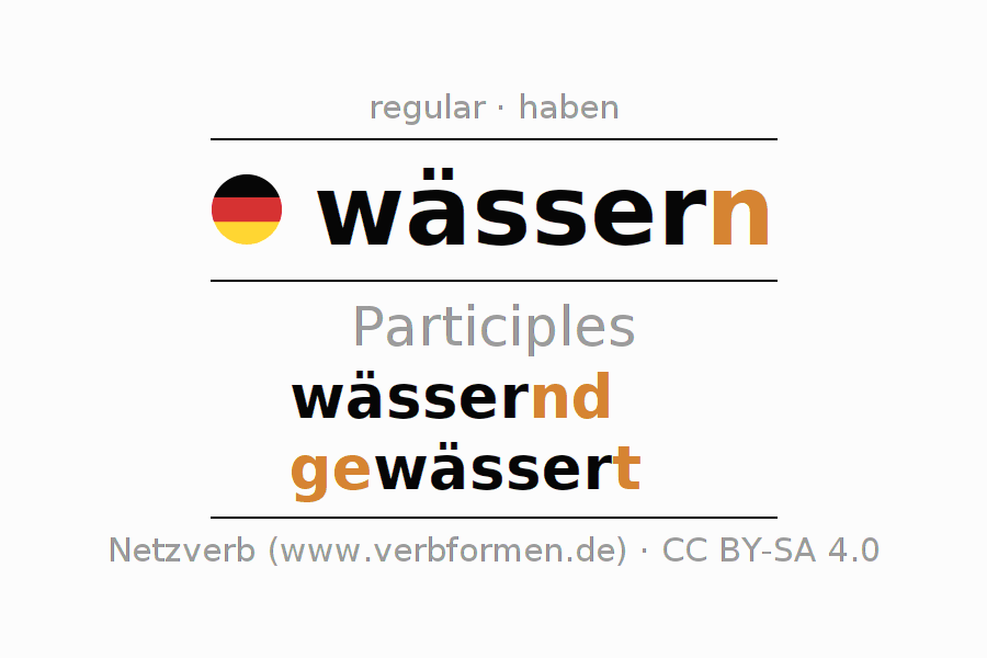 The conjugation of wässern in Participle Present Perfect part of speech Active is wässernd, gewässert.The conjugation corresponds to certain grammatical rules. Likewise the requirements for the conjugation of the simple verb forms of wässern in Participle. Comments ☆