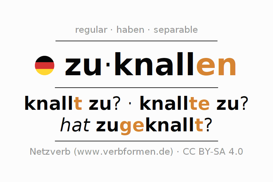 The conjugation of zuknallen in Participle Present Perfect part of speech Active is zuknallend, zugeknallt.The conjugation corresponds to certain grammatical rules. Likewise the requirements for the conjugation of the simple verb forms of zuknallen in Participle. Comments ☆
