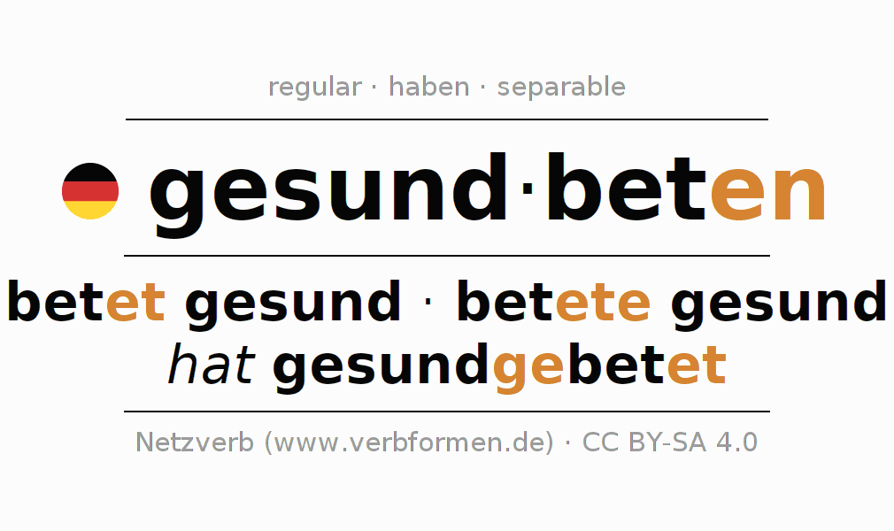 The verb gesundbeten fully conjugated in all persons and numbers in the Participle Present Perfect