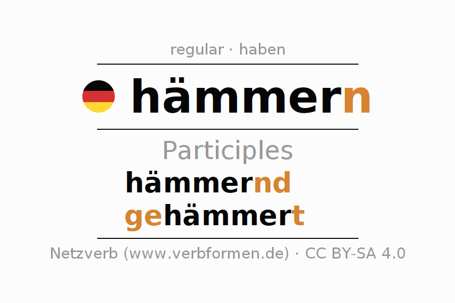 The verb hämmern fully conjugated in all persons and numbers in the Participle Present Perfect
