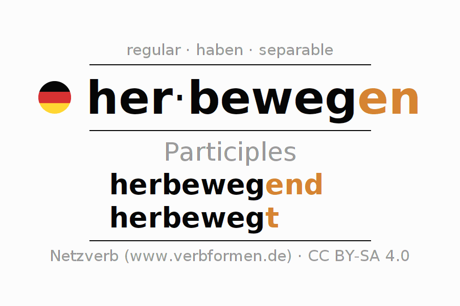 The verb herbewegen fully conjugated in all persons and numbers in the Participle Present Perfect
