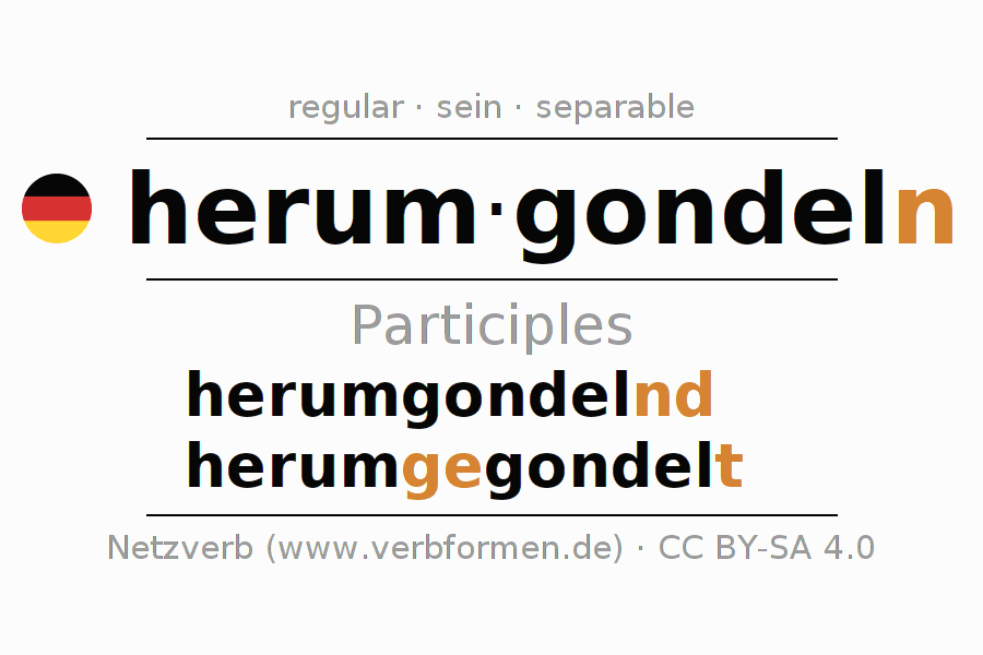 The participles of herumgondeln (amble, drift) are: herumgondelnd, herumgegondelt.