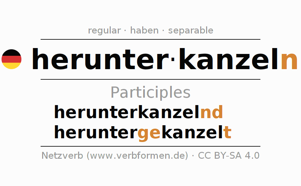 The verb herunterkanzeln fully conjugated in all persons and numbers in the Participle Present Perfect