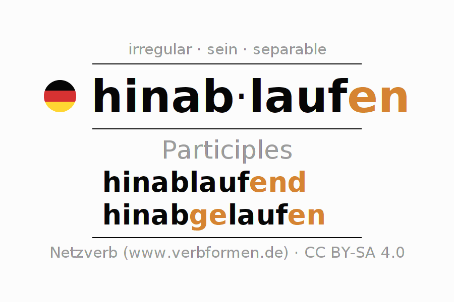 The verb hinablaufen fully conjugated in all persons and numbers in the Participle Present Perfect