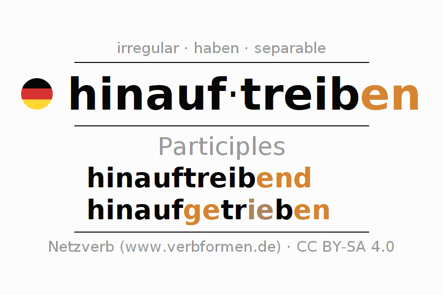 The verb hinauftreiben fully conjugated in all persons and numbers in the Participle Present Perfect