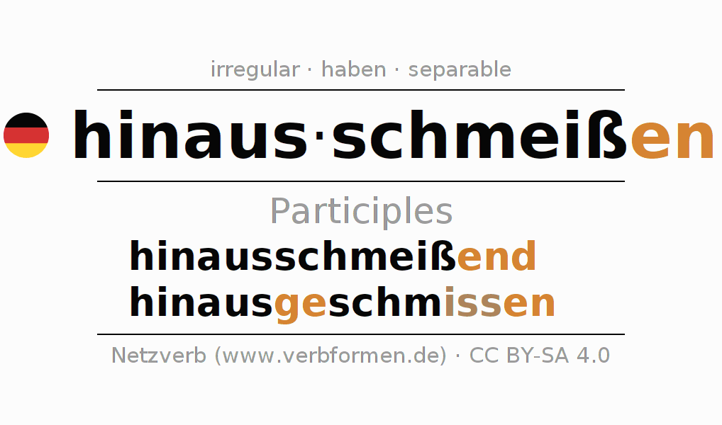 The verb hinausschmeißen fully conjugated in all persons and numbers in the Participle Present Perfect
