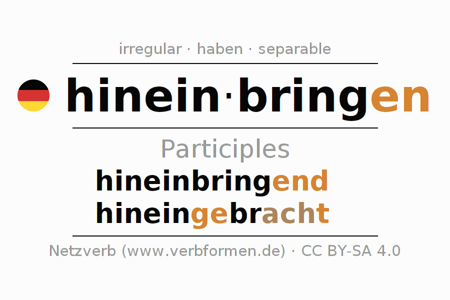 The verb hineinbringen fully conjugated in all persons and numbers in the Participle Present Perfect