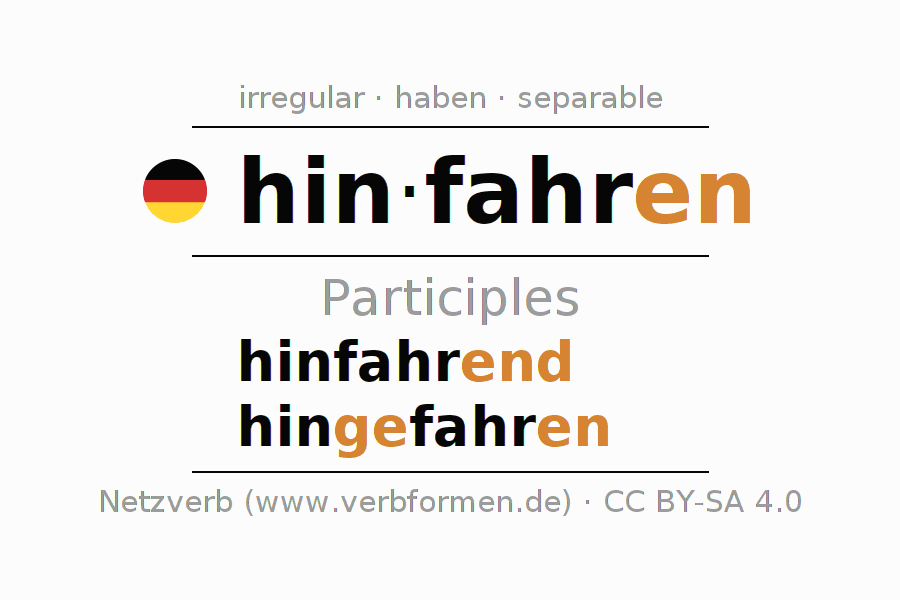 The verb hinfahren fully conjugated in all persons and numbers in the Participle Present Perfect