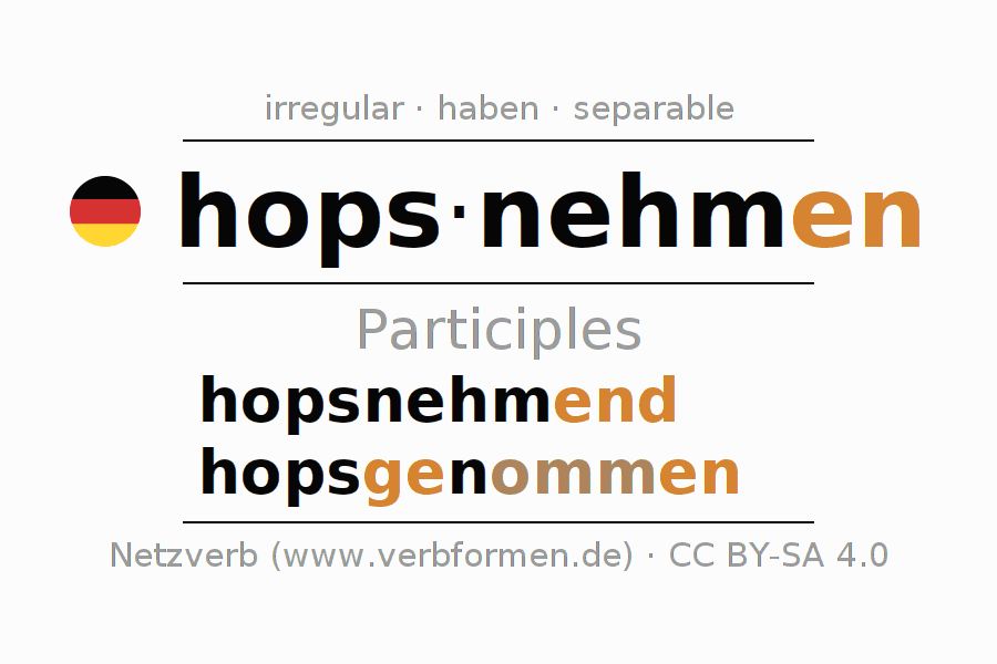 The verb hopsnehmen fully conjugated in all persons and numbers in the Participle Present Perfect