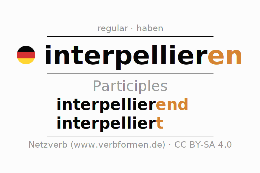 The participles of interpellieren (interpellate, question) are: interpellierend, interpelliert.