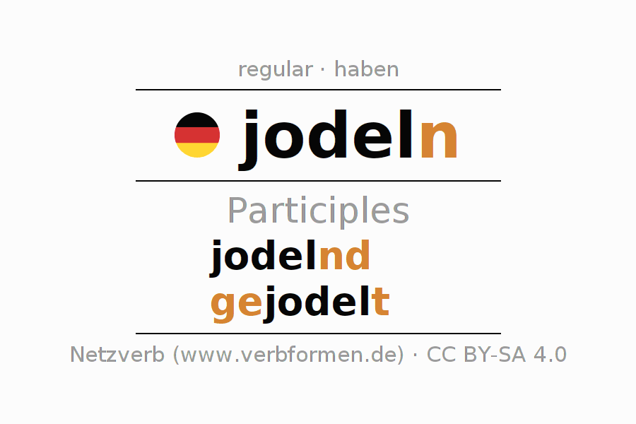 The verb jodeln fully conjugated in all persons and numbers in the Participle Present Perfect