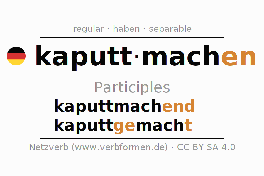 The verb kaputtmachen fully conjugated in all persons and numbers in the Participle Present Perfect