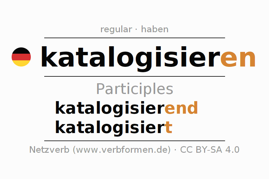 The verb katalogisieren fully conjugated in all persons and numbers in the Participle Present Perfect
