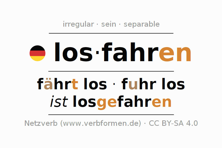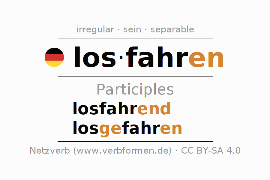 The verb losfahren fully conjugated in all persons and numbers in the Participle Present Perfect