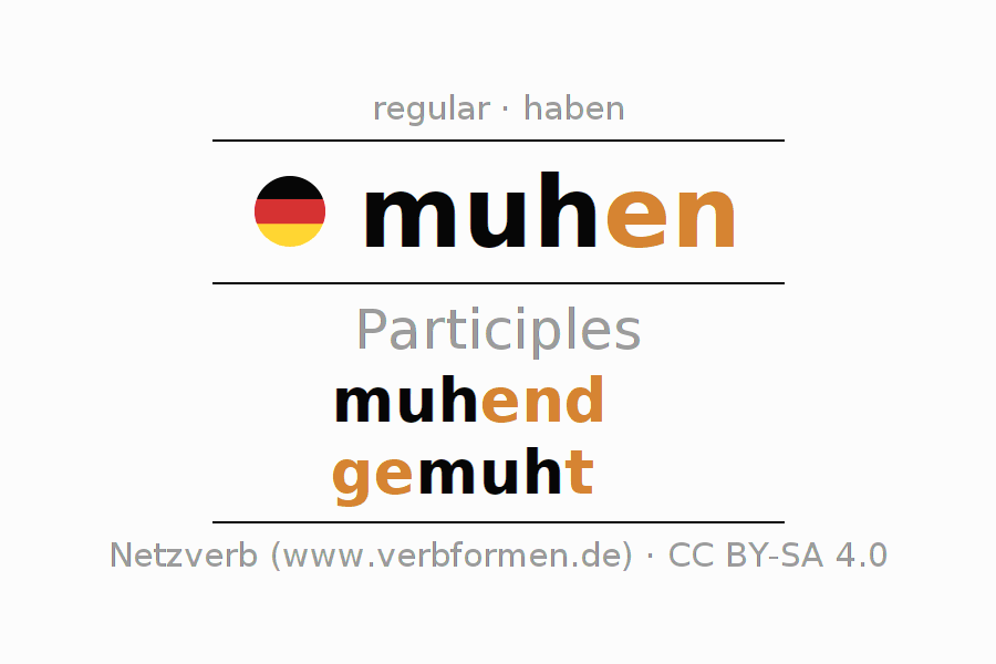 The participles of muhen (moo, low) are: muhend, gemuht.