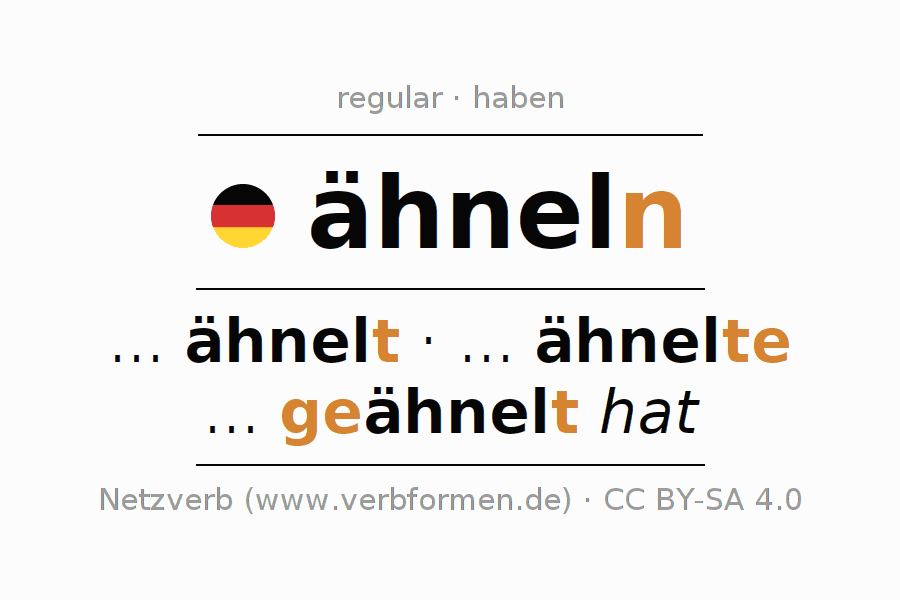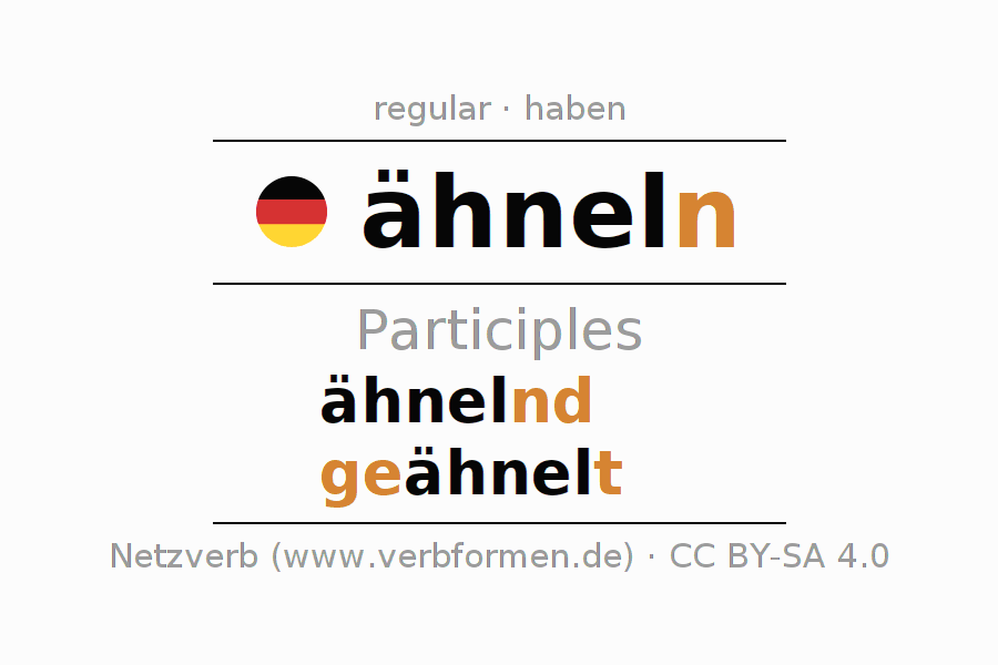 The conjugation of ähneln in Participle Present Perfect part of speech Active is ähnelnd, geähnelt.The conjugation corresponds to certain grammatical rules. Likewise the requirements for the conjugation of the simple verb forms of ähneln in Participle. Comments ☆