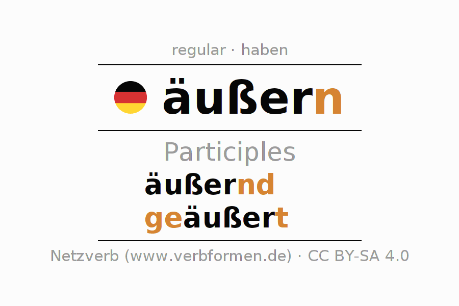 The conjugation of äußern in Participle Present Perfect part of speech Active is äußernd, geäußert.The conjugation corresponds to certain grammatical rules. Likewise the requirements for the conjugation of the simple verb forms of äußern in Participle. Comments ☆