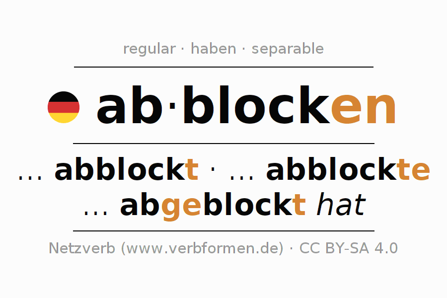 The conjugation of abblocken in Participle Present Perfect part of speech Active is abblockend, abgeblockt.The conjugation corresponds to certain grammatical rules. Likewise the requirements for the conjugation of the simple verb forms of abblocken in Participle. Comments ☆