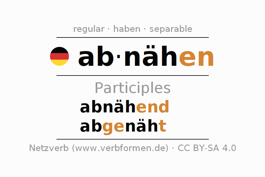 The conjugation of abnähen in Participle Present Perfect part of speech Active is abnähend, abgenäht.The conjugation corresponds to certain grammatical rules. Likewise the requirements for the conjugation of the simple verb forms of abnähen in Participle. Comments ☆