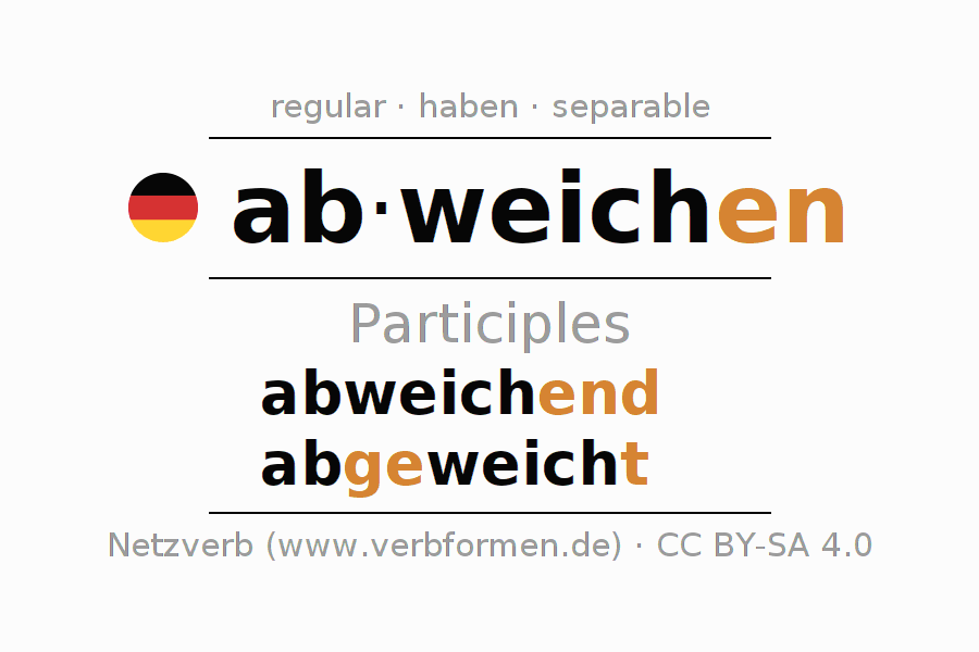The conjugation of abweichen in Participle Present Perfect part of speech Active is abweichend, abgeweicht.The conjugation corresponds to certain grammatical rules. Likewise the requirements for the conjugation of the simple verb forms of abweichen in Participle. Comments ☆