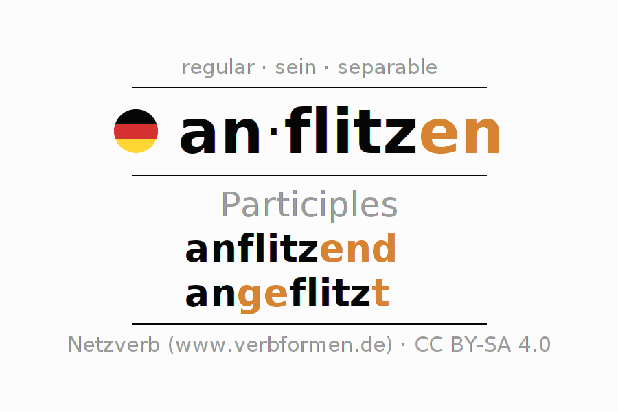 The conjugation of anflitzen in Participle Present Perfect part of speech Active is anflitzend, angeflitzt.The conjugation corresponds to certain grammatical rules. Likewise the requirements for the conjugation of the simple verb forms of anflitzen in Participle. Comments ☆