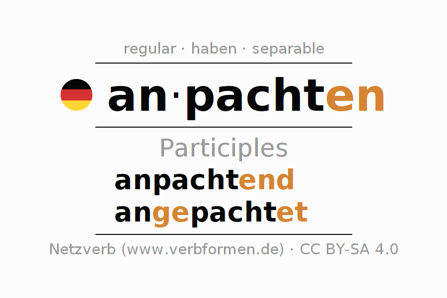 The conjugation of anpachten in Participle Present Perfect part of speech Active is anpachtend, angepachtet.The conjugation corresponds to certain grammatical rules. Likewise the requirements for the conjugation of the simple verb forms of anpachten in Participle. Comments ☆