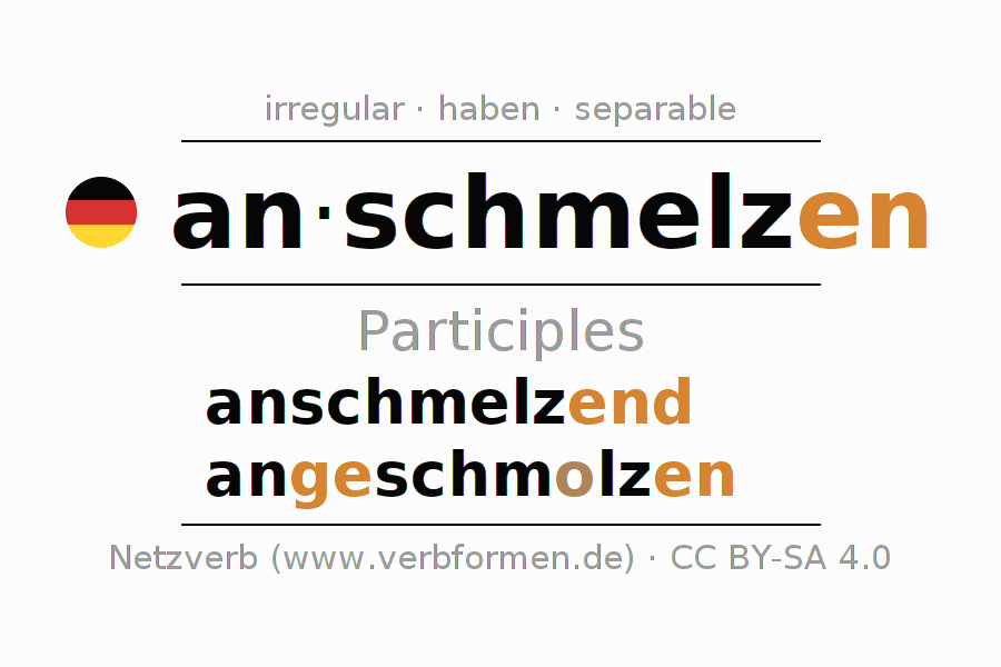 The conjugation of anschmelzen in Participle Present Perfect part of speech Active is anschmelzend, angeschmolzen.The conjugation corresponds to certain grammatical rules. Likewise the requirements for the conjugation of the simple verb forms of anschmelzen in Participle. Comments ☆