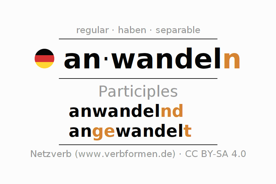 The conjugation of anwandeln in Participle Present Perfect part of speech Active is anwandelnd, angewandelt.The conjugation corresponds to certain grammatical rules. Likewise the requirements for the conjugation of the simple verb forms of anwandeln in Participle. Comments ☆