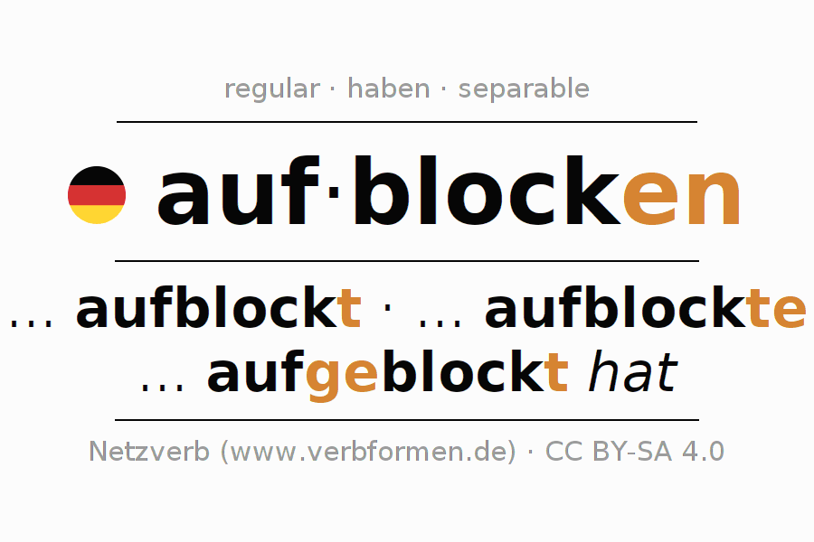 The conjugation of aufblocken in Participle Present Perfect part of speech Active is aufblockend, aufgeblockt.The conjugation corresponds to certain grammatical rules. Likewise the requirements for the conjugation of the simple verb forms of aufblocken in Participle. Comments ☆