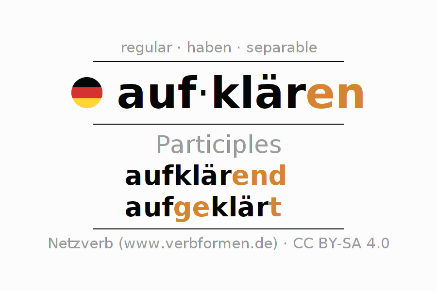 The conjugation of aufklären in Participle Present Perfect part of speech Active is aufklärend, aufgeklärt.The conjugation corresponds to certain grammatical rules. Likewise the requirements for the conjugation of the simple verb forms of aufklären in Participle. Comments ☆
