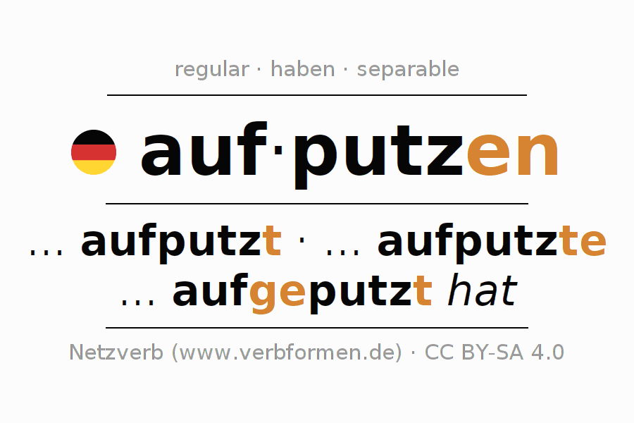 The conjugation of aufputzen in Participle Present Perfect part of speech Active is aufputzend, aufgeputzt.The conjugation corresponds to certain grammatical rules. Likewise the requirements for the conjugation of the simple verb forms of aufputzen in Participle. Comments ☆