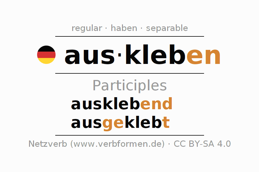 The conjugation of auskleben in Participle Present Perfect part of speech Active is ausklebend, ausgeklebt.The conjugation corresponds to certain grammatical rules. Likewise the requirements for the conjugation of the simple verb forms of auskleben in Participle. Comments ☆
