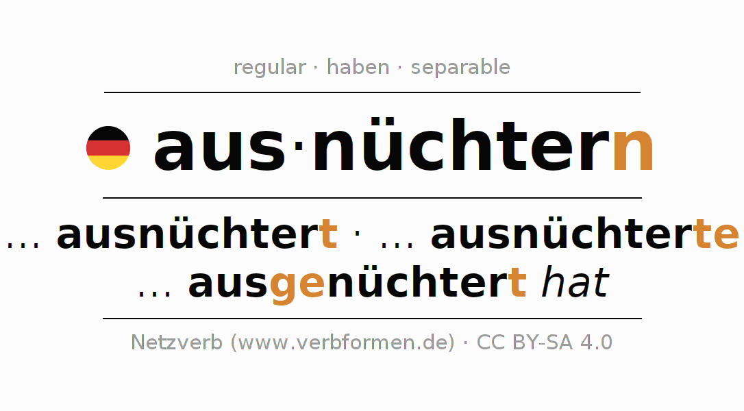 The conjugation of ausnüchtern in Participle Present Perfect part of speech Active is ausnüchternd, ausgenüchtert.The conjugation corresponds to certain grammatical rules. Likewise the requirements for the conjugation of the simple verb forms of ausnüchtern in Participle. Comments ☆