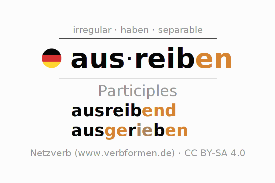The conjugation of ausreiben in Participle Present Perfect part of speech Active is ausreibend, ausgerieben.The conjugation corresponds to certain grammatical rules. Likewise the requirements for the conjugation of the simple verb forms of ausreiben in Participle. Comments ☆