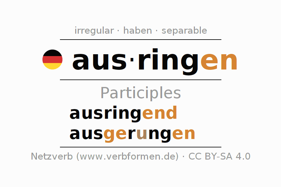 The conjugation of ausringen in Participle Present Perfect part of speech Active is ausringend, ausgerungen.The conjugation corresponds to certain grammatical rules. Likewise the requirements for the conjugation of the simple verb forms of ausringen in Participle. Comments ☆