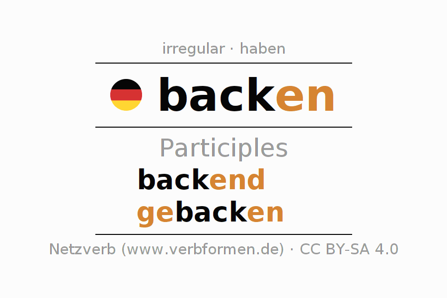 The conjugation of backen in Participle Present Perfect part of speech Active is backend, gebacken.The conjugation corresponds to certain grammatical rules. Likewise the requirements for the conjugation of the simple verb forms of backen in Participle. Comments ☆