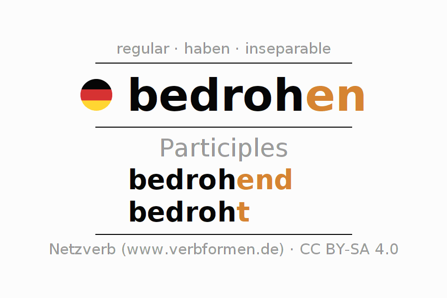 The verb bedrohen fully conjugated in all persons and numbers in the Participle Present Perfect