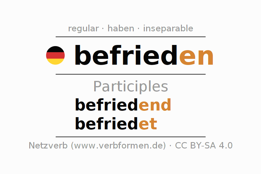 The conjugation of befrieden in Participle Present Perfect part of speech Active is befriedend, befriedet.The conjugation corresponds to certain grammatical rules. Likewise the requirements for the conjugation of the simple verb forms of befrieden in Participle. Comments ☆