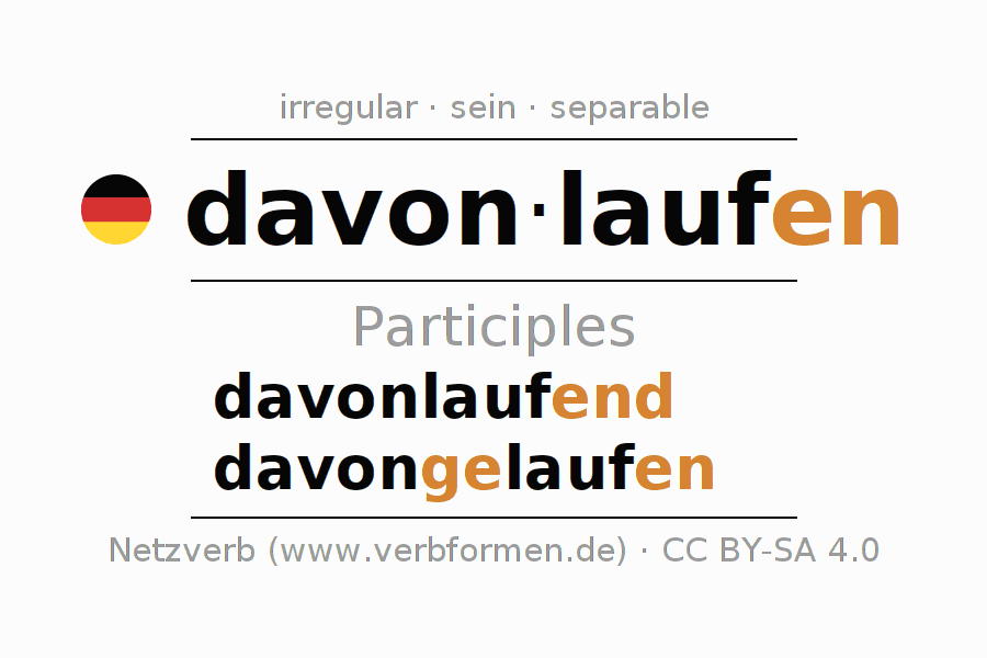 The conjugation of davonlaufen in Participle Present Perfect part of speech Active is davonlaufend, davongelaufen.The conjugation corresponds to certain grammatical rules. Likewise the requirements for the conjugation of the simple verb forms of davonlaufen in Participle. Comments ☆