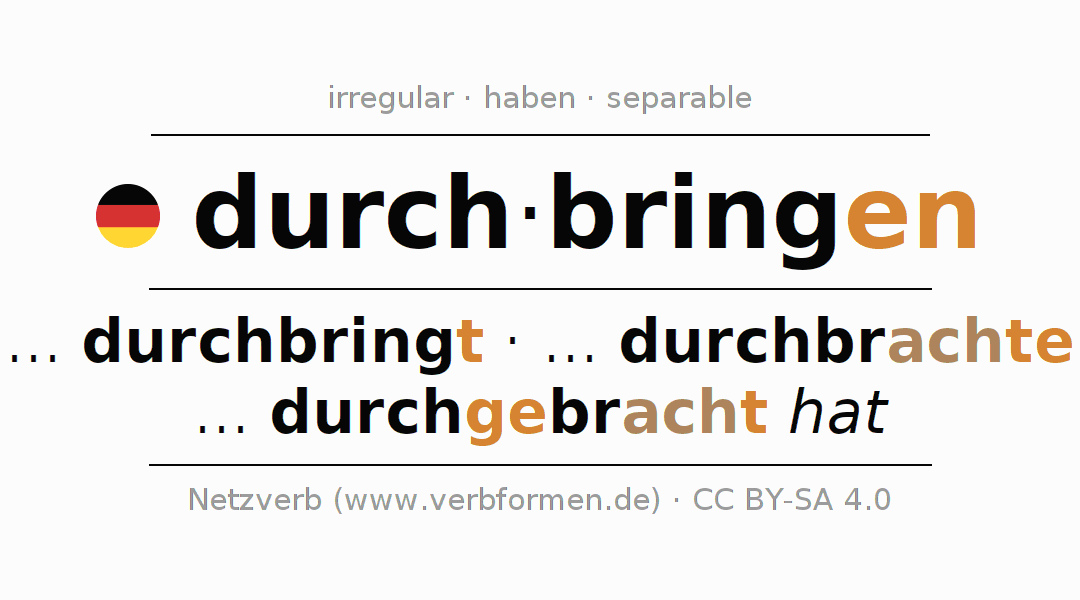 The conjugation of durchbringen in Participle Present Perfect part of speech Active is durchbringend, durchgebracht.The conjugation corresponds to certain grammatical rules. Likewise the requirements for the conjugation of the simple verb forms of durchbringen in Participle. Comments ☆