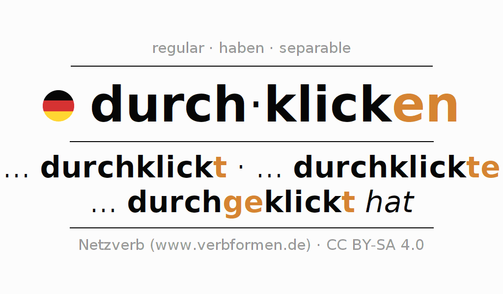 The conjugation of durchklicken in Participle Present Perfect part of speech Active is durchklickend, durchgeklickt.The conjugation corresponds to certain grammatical rules. Likewise the requirements for the conjugation of the simple verb forms of durchklicken in Participle. Comments ☆