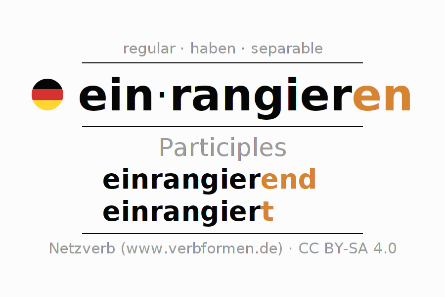 The conjugation of einrangieren in Participle Present Perfect part of speech Active is einrangierend, einrangiert.The conjugation corresponds to certain grammatical rules. Likewise the requirements for the conjugation of the simple verb forms of einrangieren in Participle. Comments ☆