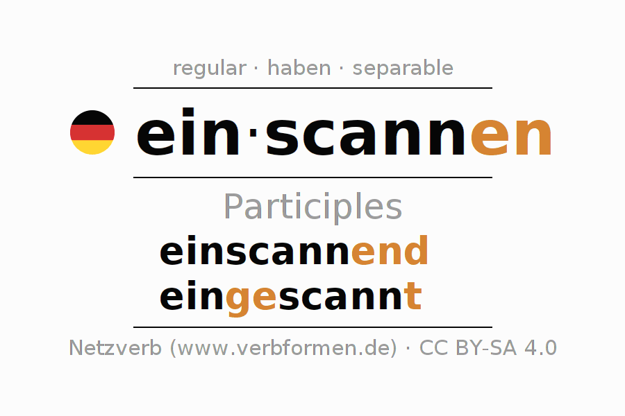The conjugation of einscannen in Participle Present Perfect part of speech Active is einscannend, eingescannt.The conjugation corresponds to certain grammatical rules. Likewise the requirements for the conjugation of the simple verb forms of einscannen in Participle. Comments ☆