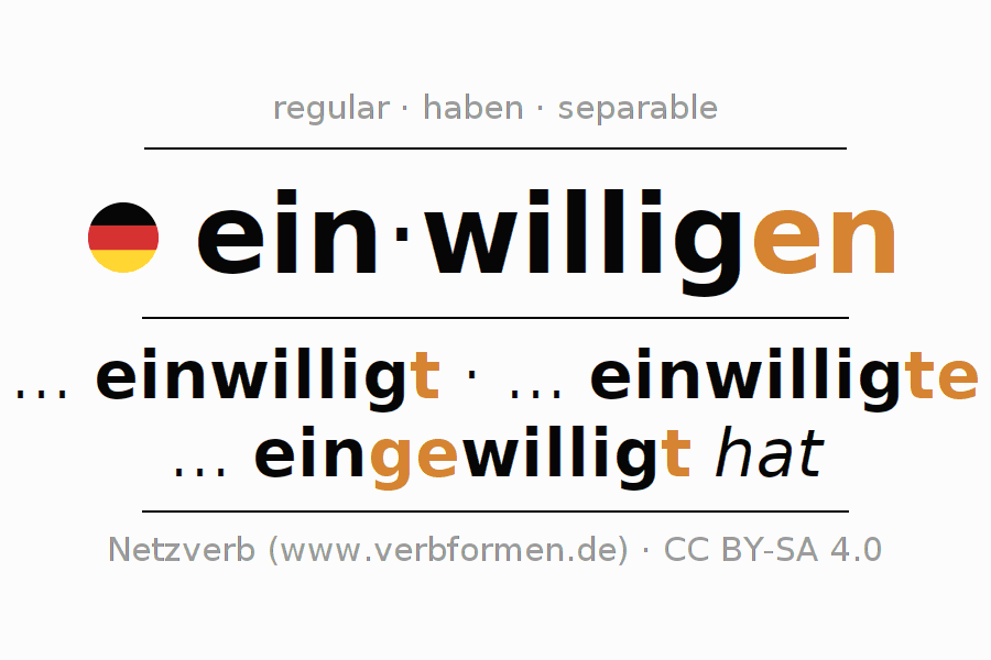 The conjugation of einwilligen in Participle Present Perfect part of speech Active is einwilligend, eingewilligt.The conjugation corresponds to certain grammatical rules. Likewise the requirements for the conjugation of the simple verb forms of einwilligen in Participle. Comments ☆