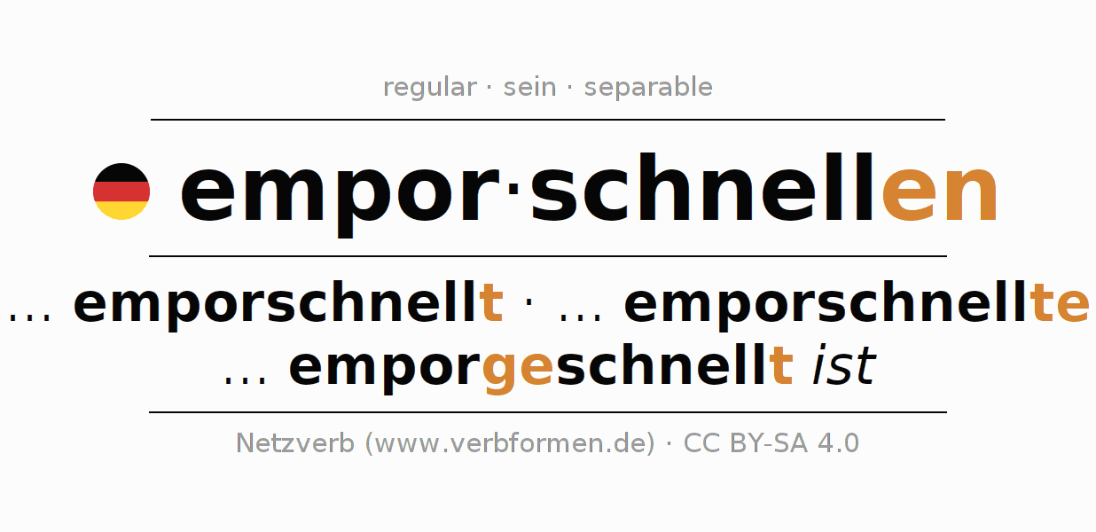 The conjugation of emporschnellen in Participle Present Perfect part of speech Active is emporschnellend, emporgeschnellt.The conjugation corresponds to certain grammatical rules. Likewise the requirements for the conjugation of the simple verb forms of emporschnellen in Participle. Comments ☆