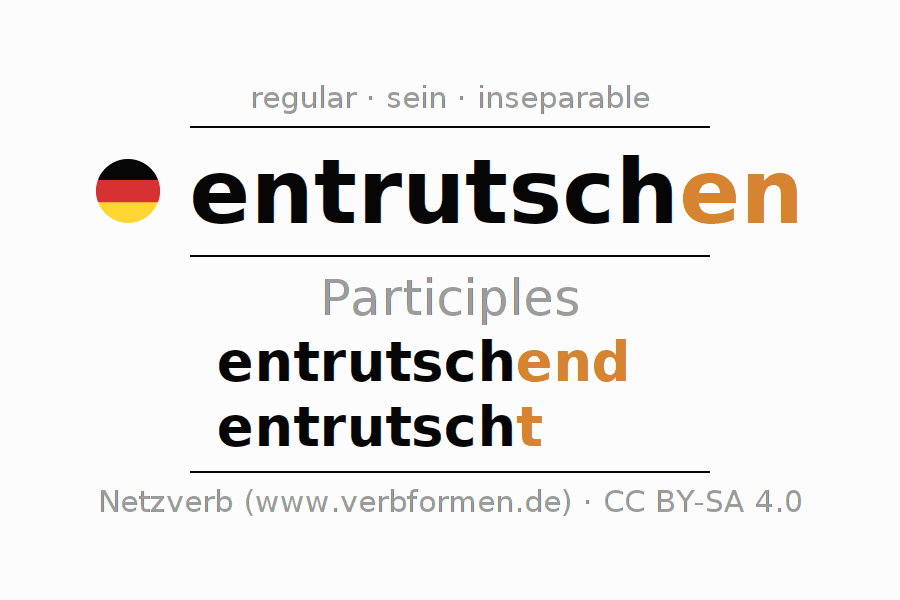 The conjugation of entrutschen in Participle Present Perfect part of speech Active is entrutschend, entrutscht.The conjugation corresponds to certain grammatical rules. Likewise the requirements for the conjugation of the simple verb forms of entrutschen in Participle. Comments ☆